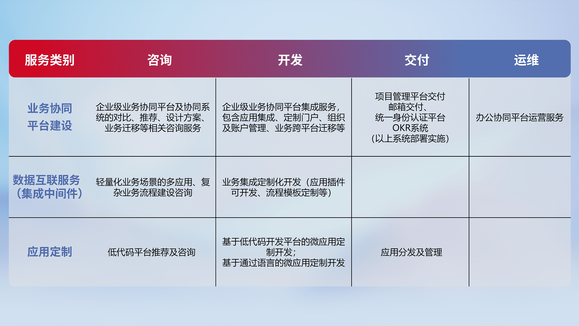 针对钉钉、、、、企微、、、、IDaas等平台级产品提供产品的规划、、、、方案、、交付、、、、定制化开发等服务,,,,实现如统一协同办公、、智能客户服务、、、混合会议管理、、智能数据查询、、、等业务场景,,,,实现数字化转型。。